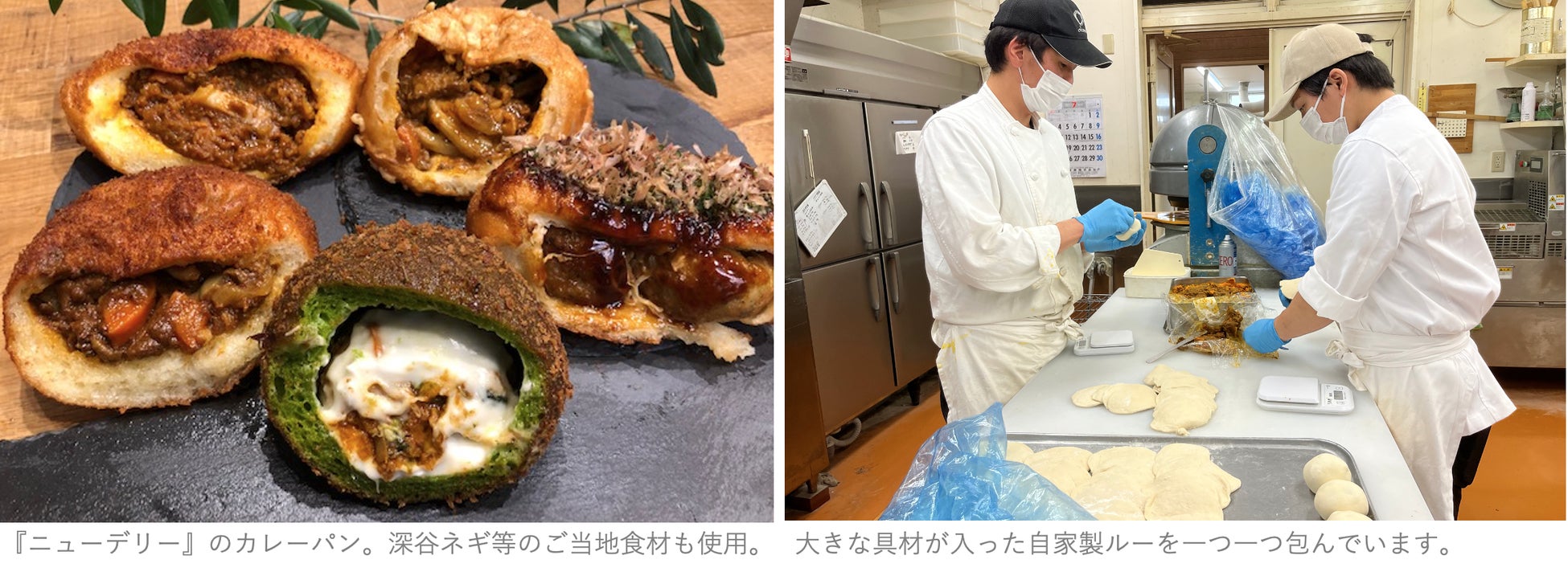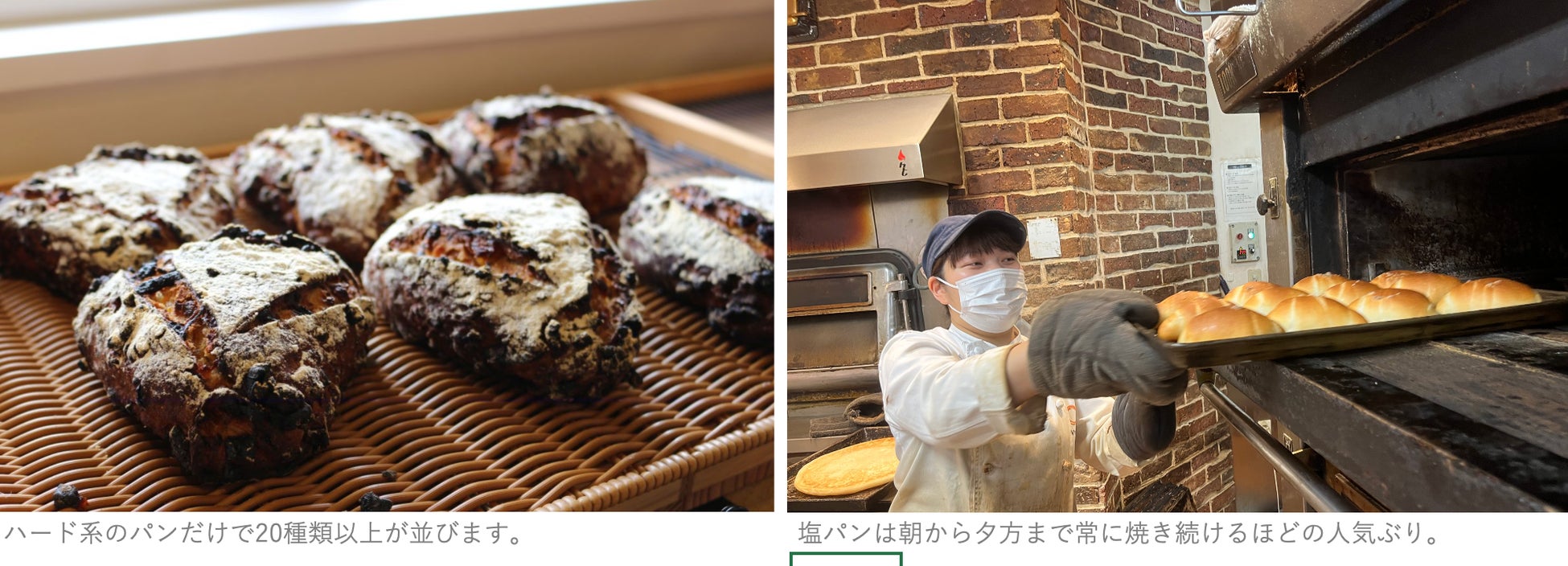 定番の「塩パン」はシンプルながらも1日2000個を焼き上げるほどの人気で、たっぷりの発酵バターを包んだじゅわっという食感と、バターの香りや甘さ、塩味(えんみ)が特徴です。パン作りだけでなく具材作りも、野菜や精肉のカットなどの下ごしらえからスタート。カレーパンのルーや、自家製クリームなども、併設キッチンの中で一から調理しています。素材を生かすシンプルなレシピをもとに、全工程にこだわりを持ってパンを作っています。