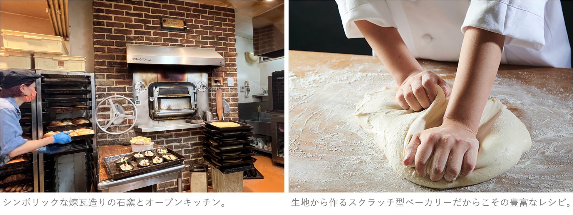 “職人のつくるパンの美味しさをいかに伝えるか”を目指し、パン製造の工程を見ることができるオープンキッチンや、煉瓦で組上げた本格的なスペイン製の石窯を構え、粉から作りあげるスクラッチベーカリーの魅力を発信しながら焼きたてのパンを提供しています。