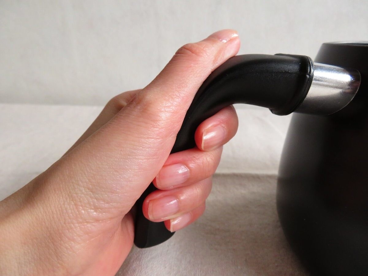 ぐいっと曲がった持ち手は、沸かしたお湯を注ぎやすく、また省スペースで収納できる設計です。<br> 調理時は熱くなりやすいので、コンロの中心から少しずらして使うことをおすすめします。底面積が広いので、多少ずらしても五徳から落ちることはないですよ。