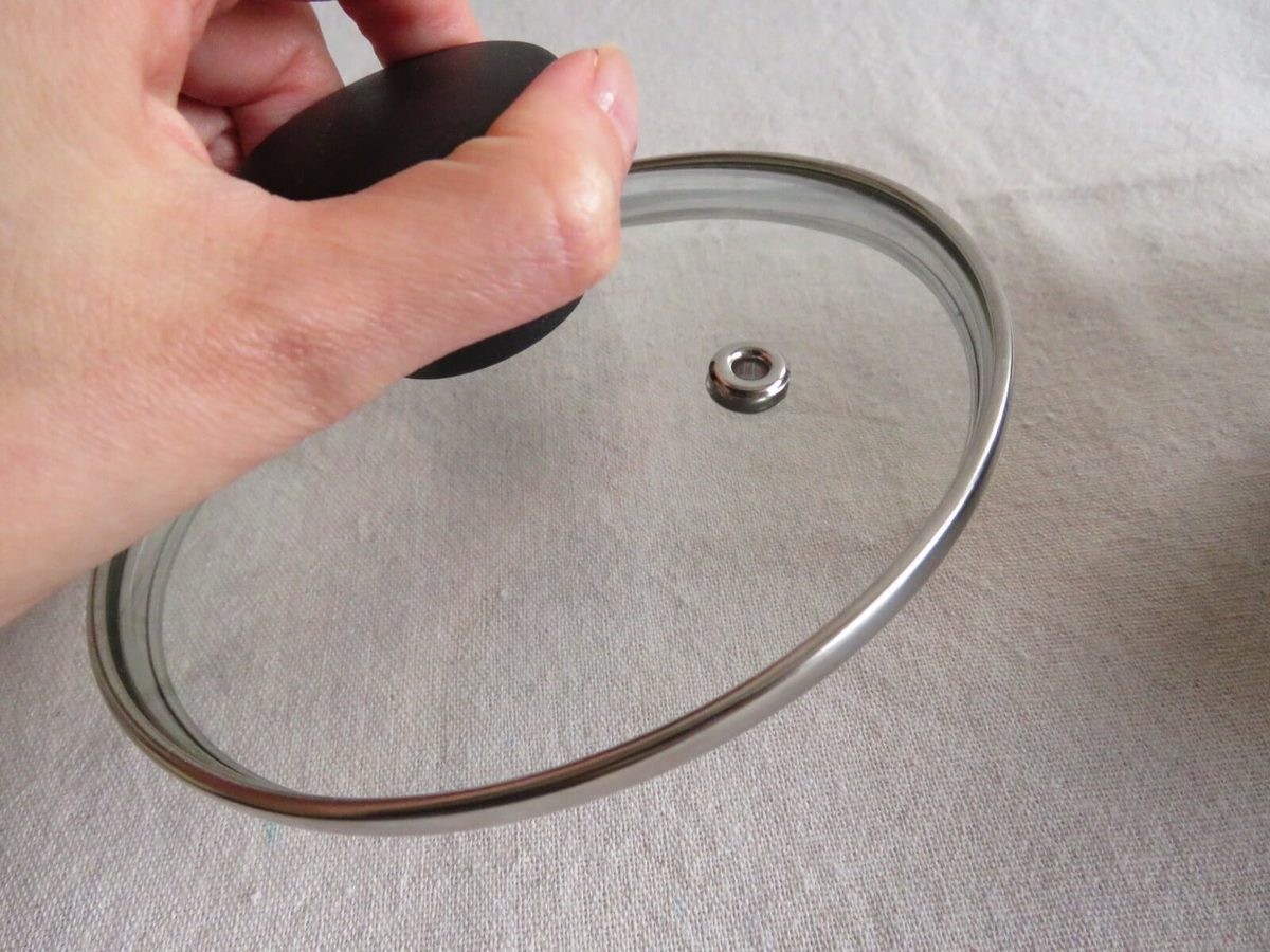 強化ガラスの蓋が付属しています。中身が見える透明タイプで、蒸気穴あり。