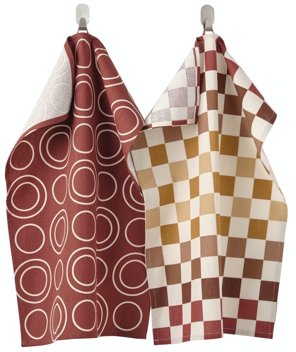 キッチンクロス2枚のセット。1枚はブラウンの生地にホワイトの円、もう1枚はオータムカラーの四角い柄が入っています。