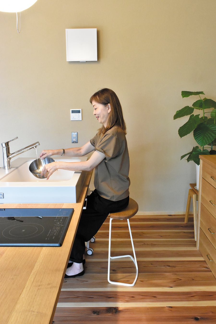 「アンフォルム」は、家族が一緒に過ごす時間がより豊かになってほしいという想いから、ダイニングテーブルにシンクとIHを組み込みこんだテーブルキッチンという発想からデザイン開発がスタートしました。従来のキッチンと大きく違うのは天板の高さ。キッチンの規格はH800〜950mmですが、「アンフォルム」の天板はH700mm。これは、椅子にゆったり座って食べたりくつろぐのに最適な高さ。従来のキッチンよりも10cm以上低い高さですが、煮炊きの作業に問題はなく、むしろ鍋やフライパンの中が見やすくて作業しやすいという声も。シンクの高さはH800mmなので、洗い物やここにまな板を置けば食材の下ごしらえなどは従来のキッチンと同様の作業性を備えています。