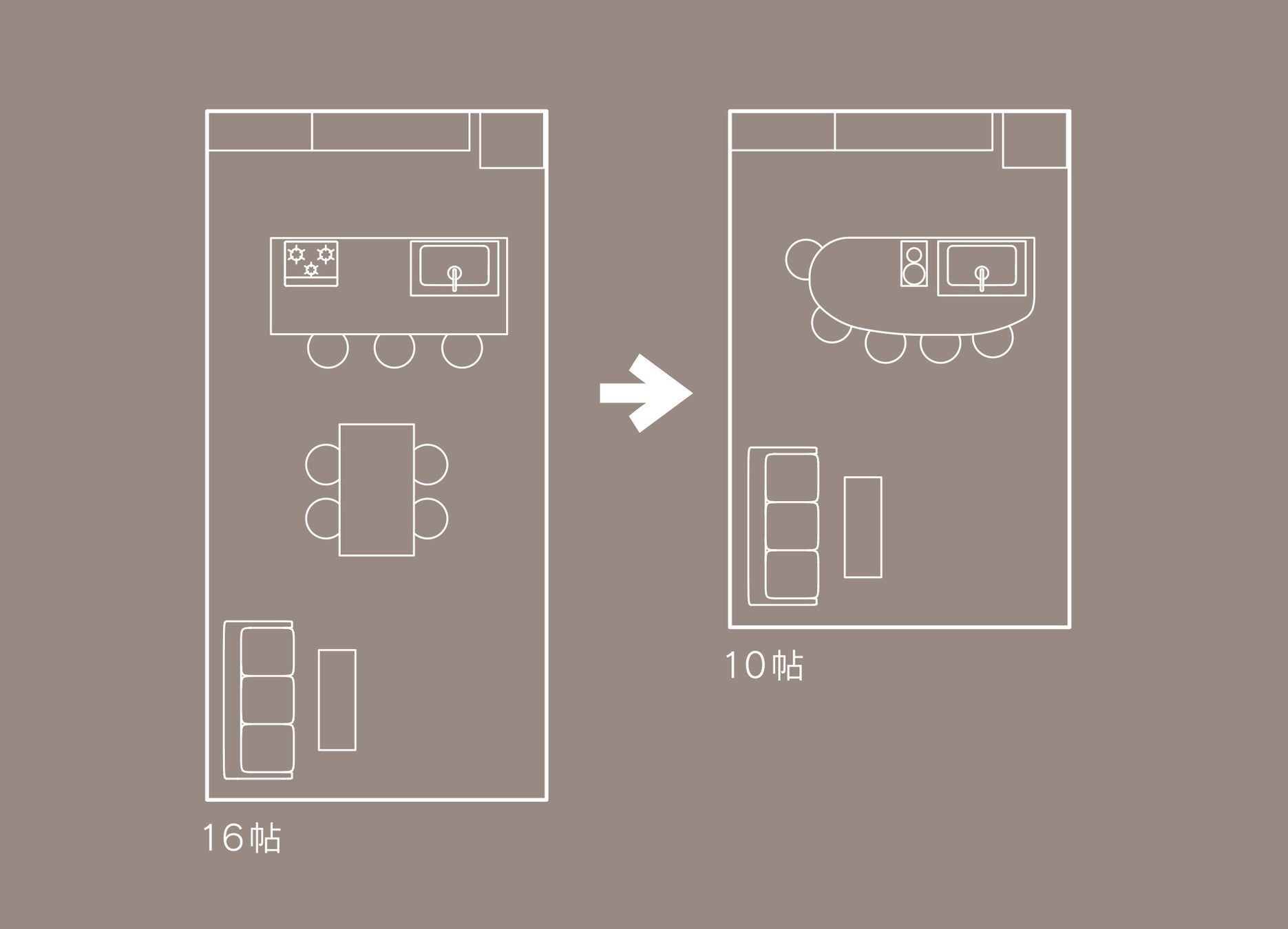 住まいの間取りや空間デザインの面においても、アイランドキッチンを配したダイニングキッチンとは一味も二味も違う設計を可能にします。従来のLDKに必要な床面積が16帖とすれば、「アンフォルム」なら10帖。この差によって建築面積を抑えることも、ゆとりの空間を生み出すこともできます。