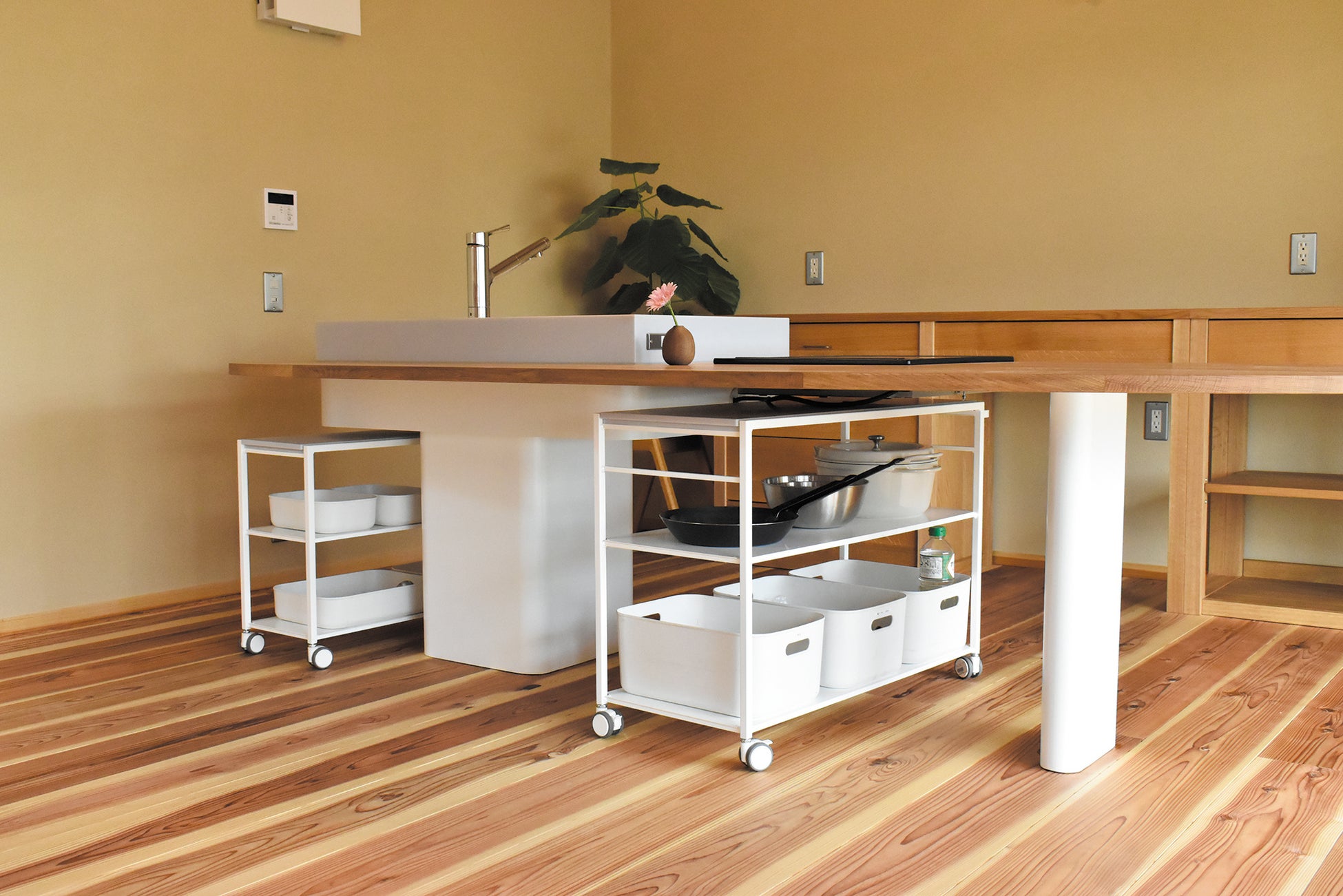 アンダーシェルフは天板下にすっきり収まるデザインです。引き出せば、作業用テーブルとしても使える機能性を備えます。