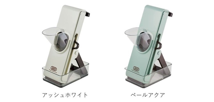 カッターパーツは平切り、細切り、千切りの3種類。目的に応じてパーツを変え、スライスすることができます。平切り用は、刃の表裏を切り替えることで、2mmと4mmの厚み調整が可能なので、料理の幅が広がります!使い終わったあとはたたんでコンパクトにできるので、収納にも困りません。掃除用ブラシがついていてお手入れも簡単。カラーは、アッシュホワイトとペールアクアの2色からお選びいただけます。大変な料理の下ごしらえが簡単にできる便利なキッチングッズ、ぜひお試しください!