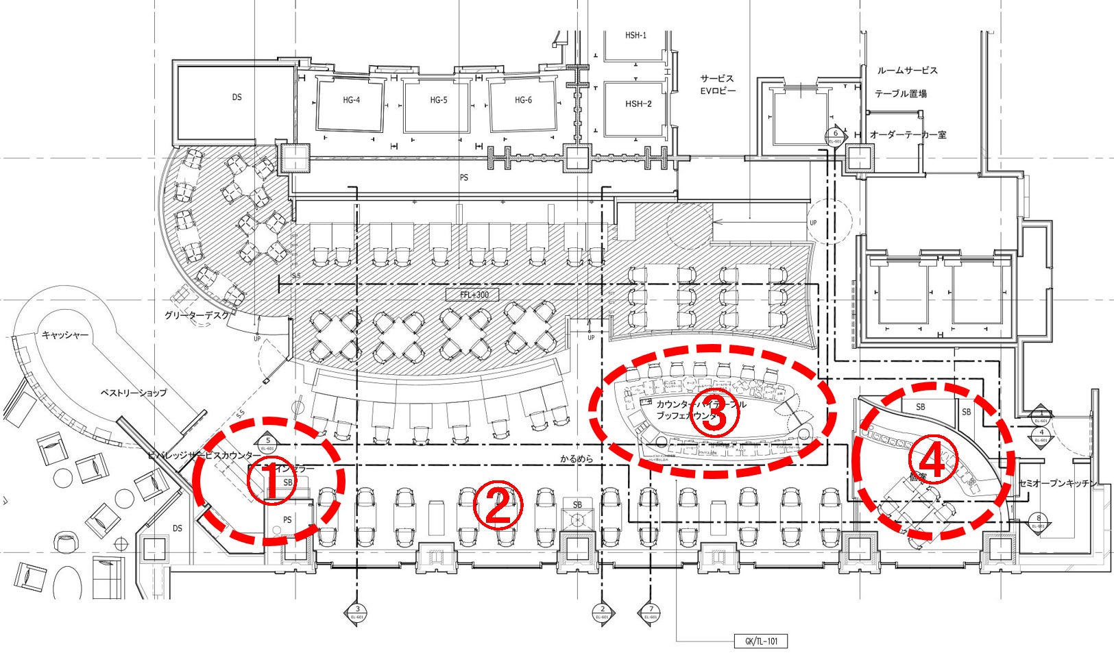 ③【ブッフェカウンター】面積を大きくして、これまでより多くの朝食メニューが提供できるように変更。夜はカウンター席として活用するほか、ワインなどのアルコールを提供する場所にも。またカウンター内側にスタッフが入れる形にしたことでサービス導線を確保し、スムーズな料理提供が可能に。