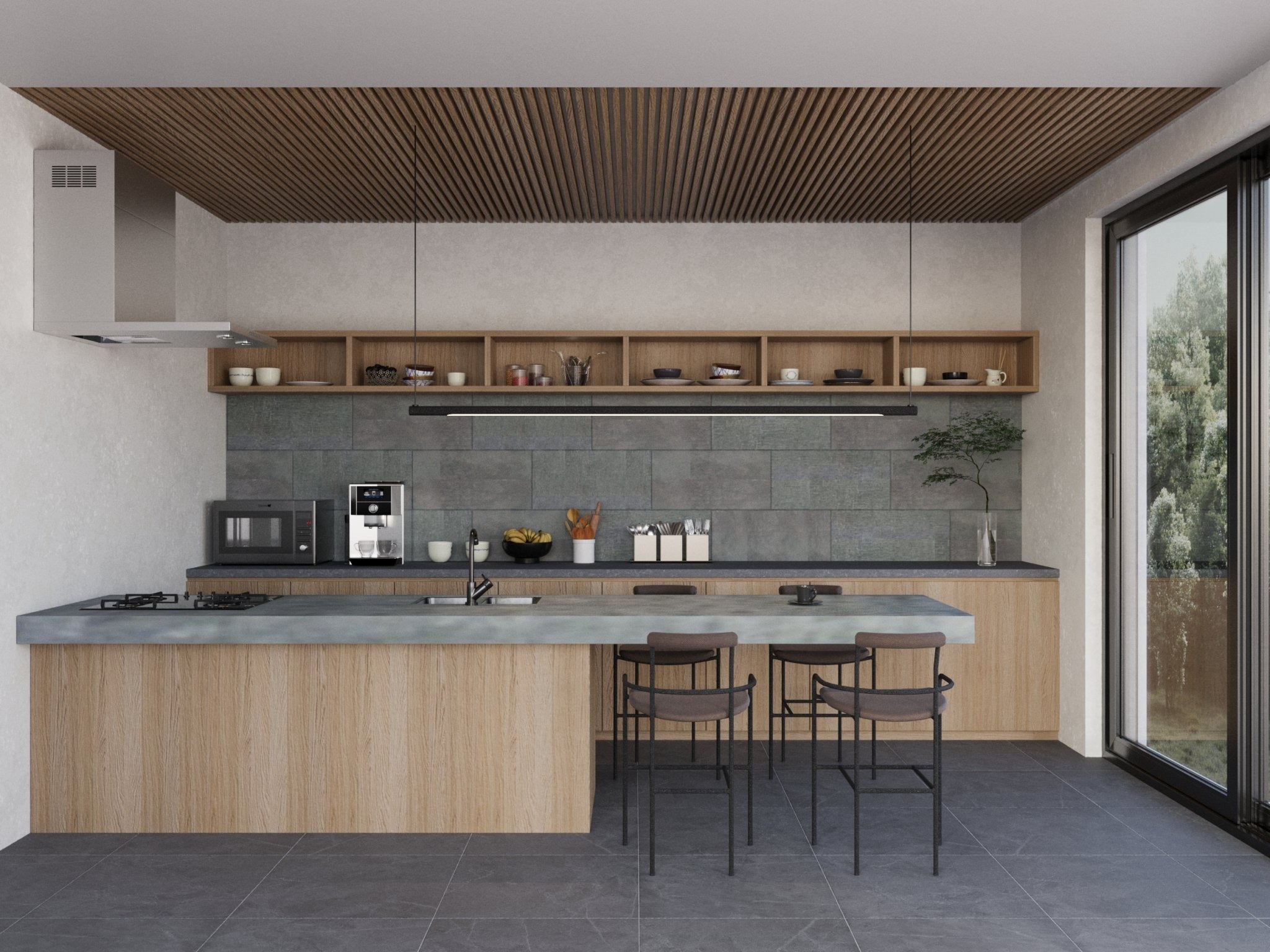 ステンレス天板とオークの天然木(突板)の組み合わせ。自然な木の表情が感じられ、暖かみのあるデザインを表現しました。