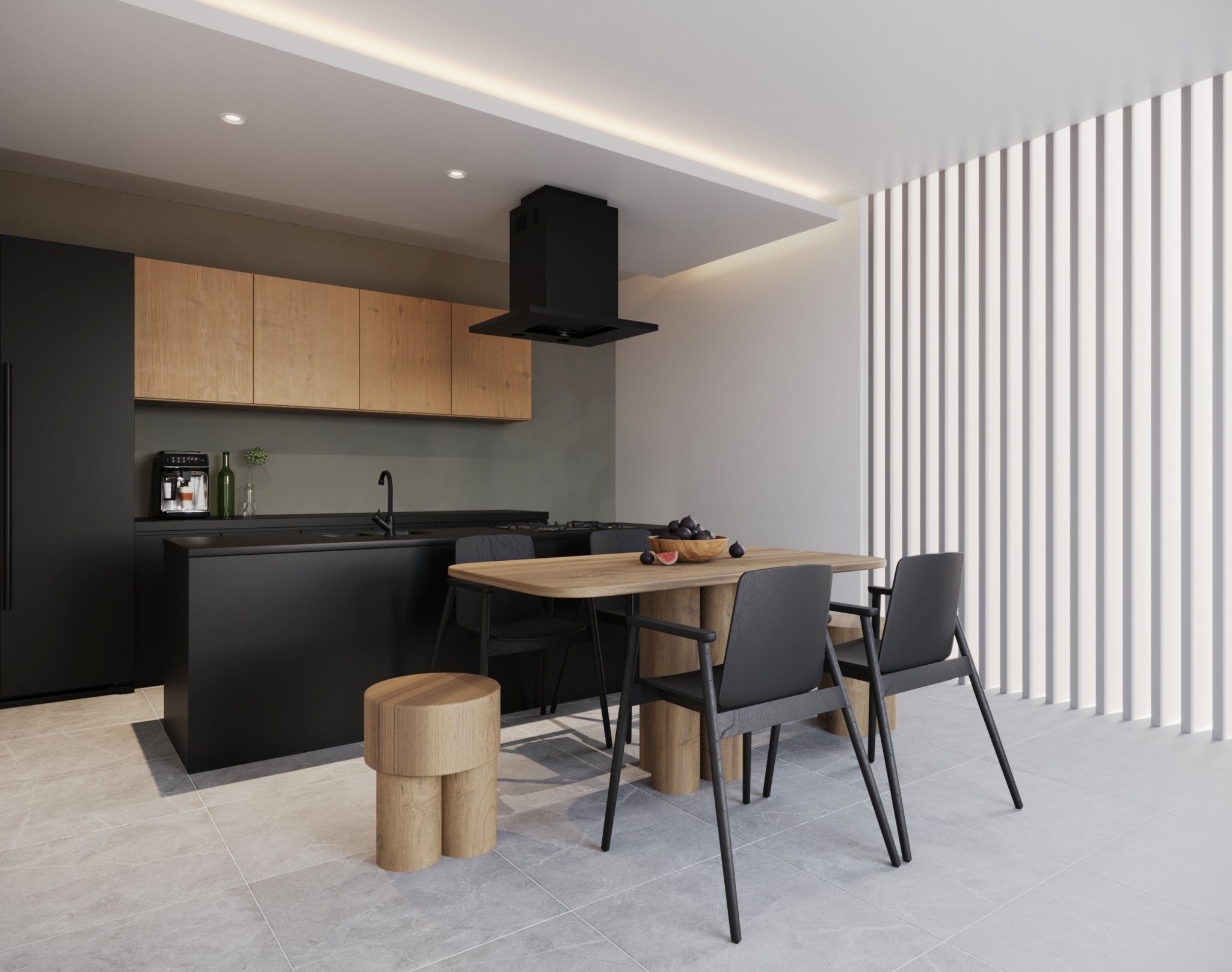 オールブラック仕上げのキッチン。取っ手レスのデザインとシャープな天板が高級感溢れるデザインを実現しました。